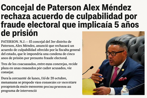 PATERSON, N.J. — El concejal del 3er distrito de Paterson, Alex Méndez, anunció que rechazará un acuerdo de culpabilidad ofrecido por la fiscalía general del estado, que le impondría una condena de cinco años de prisión por presunto fraude electoral.